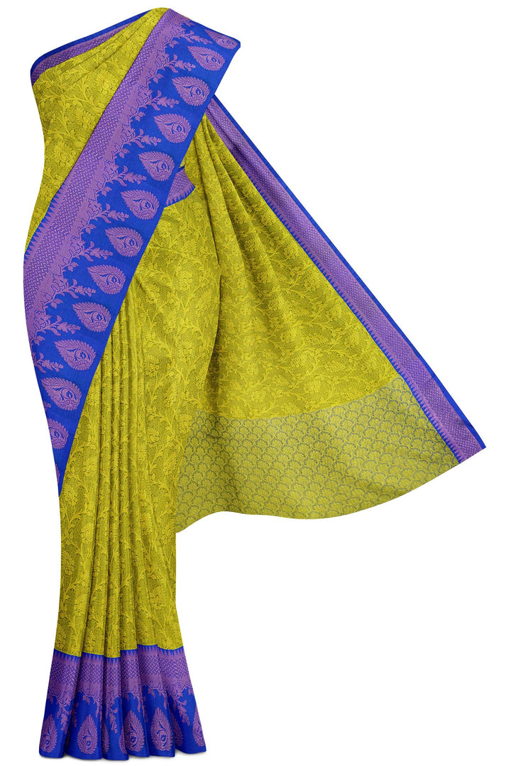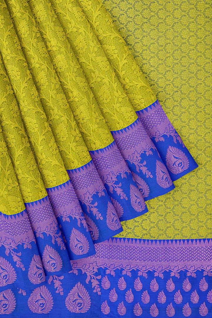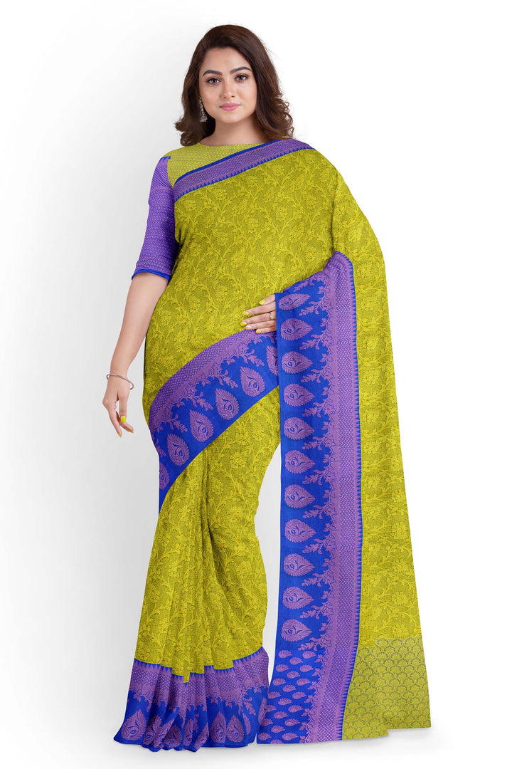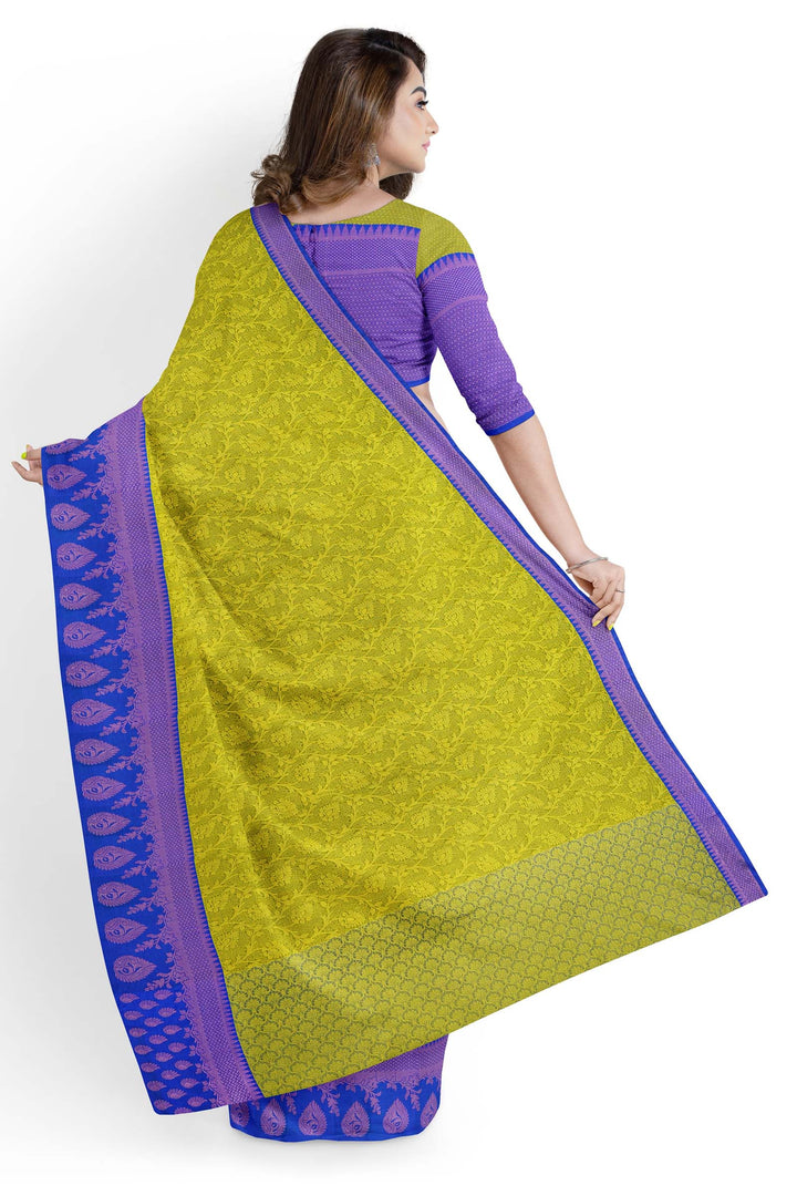 Corn yellow combination saree with a blue color border in semi silk cotton fabric is a bold and eye-catching choice. By keeping your accessories and makeup simple and elegant.
