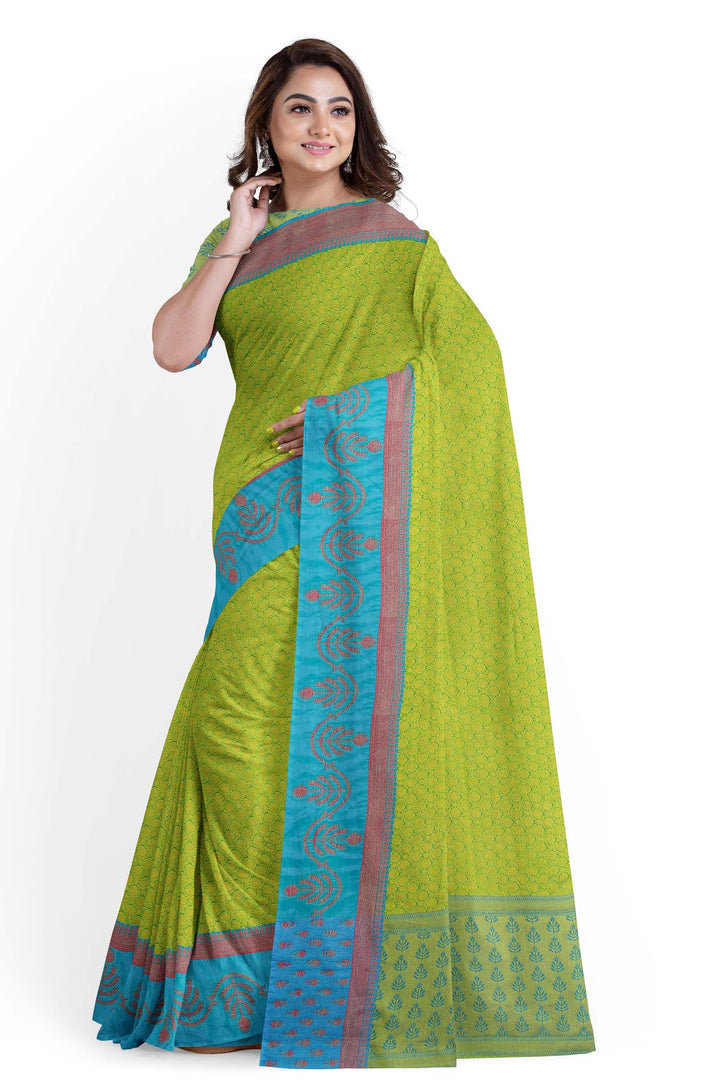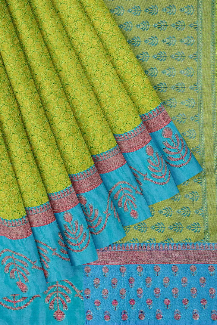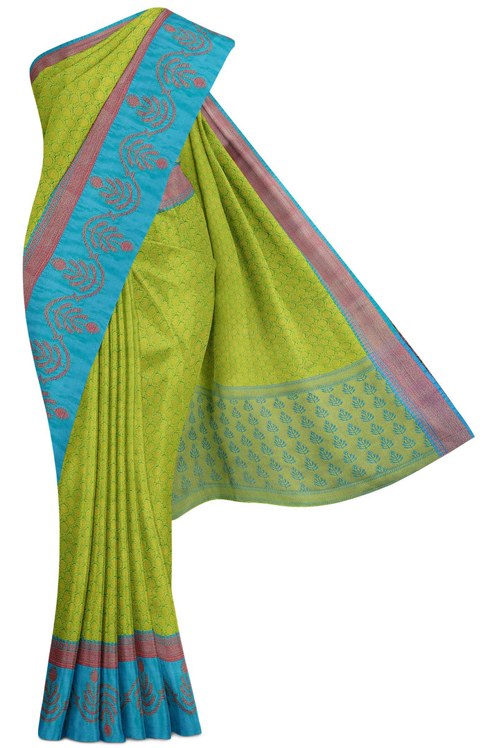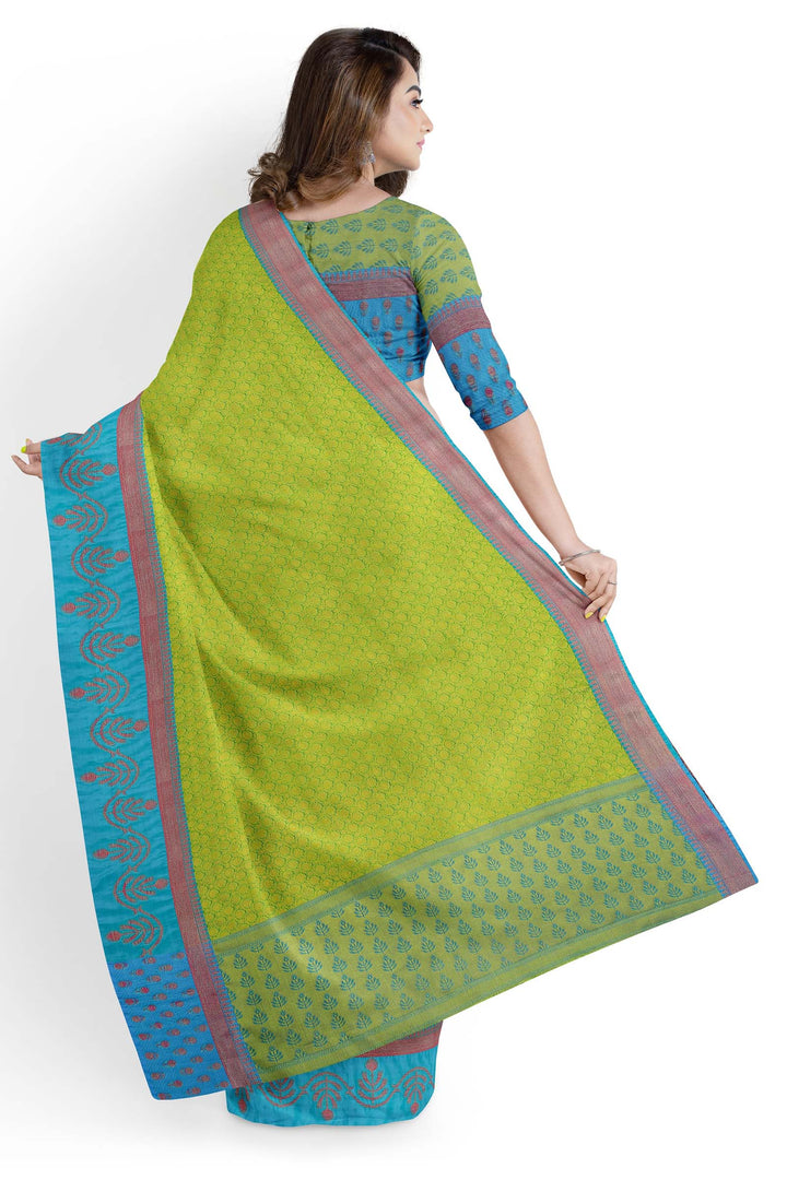 A Lime green combination saree with sky blue colour border in semi silk cotton would be fresh and vibrant, while the sky blue colour border would be cool and refreshing. The combination of these two colors would create a beautiful contrast that can make the saree stand out.